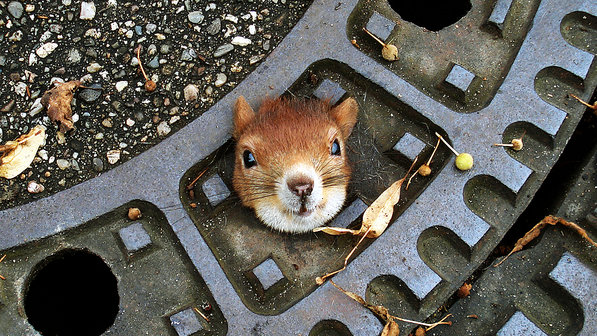 Esquilo com a cabeça entalada numa tampa de bueiro em Isernhagen, na Alemanha - AFP |